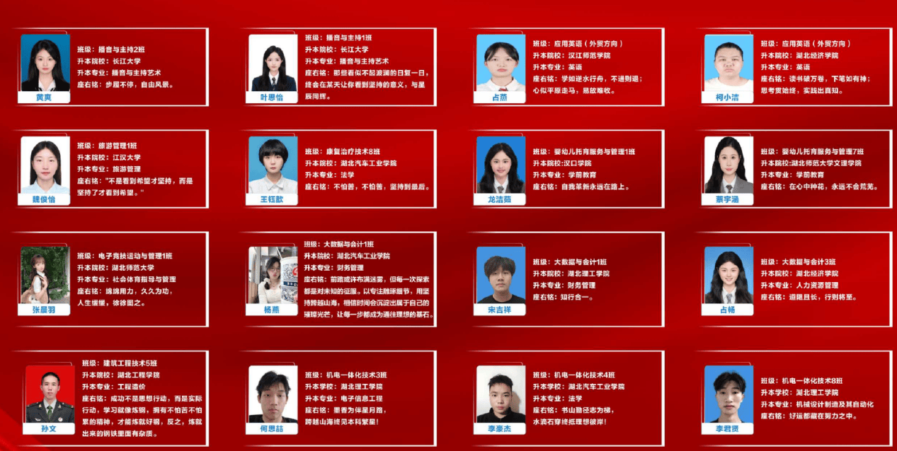 当然,这两个专业,除了选择去出名企业就业,学生也能够选择继续专升本深制,学校设立专升本特色班,近三年的升本率达75%以上,升学去向有长江大学、湖北师范大学、江汉大学、武汉商学院、湖北科技学院、湖北经济学院、湖北汽车工业学院等学校。